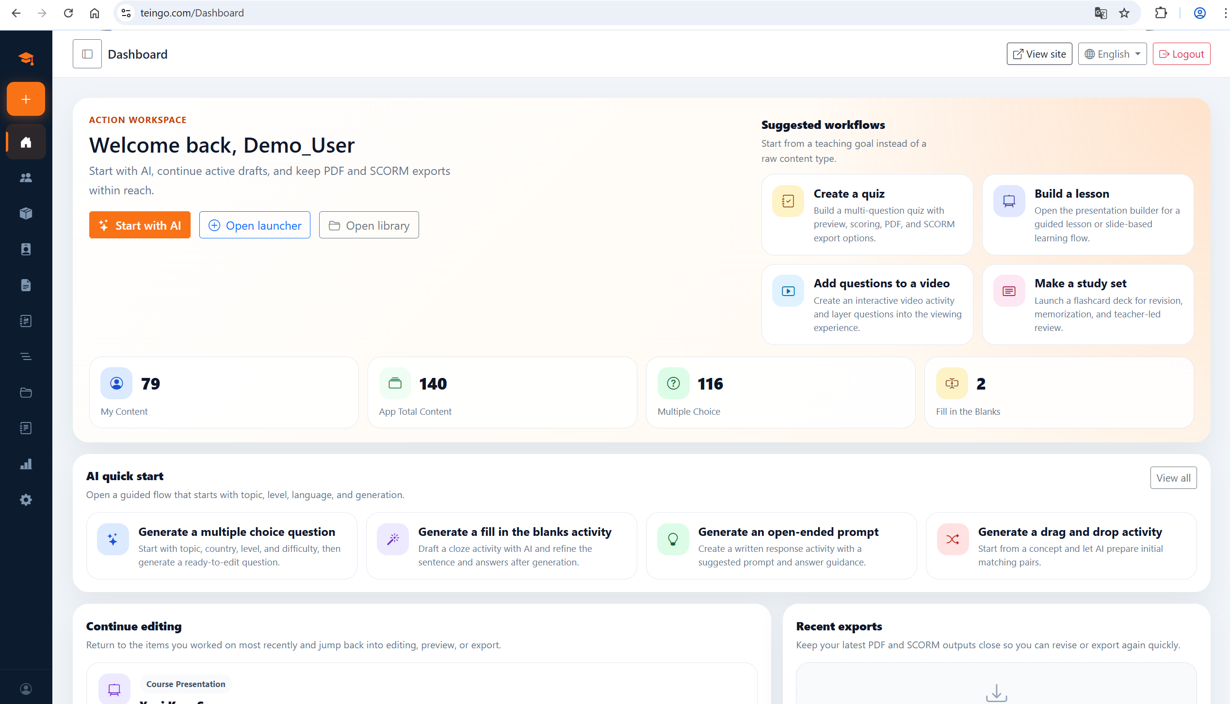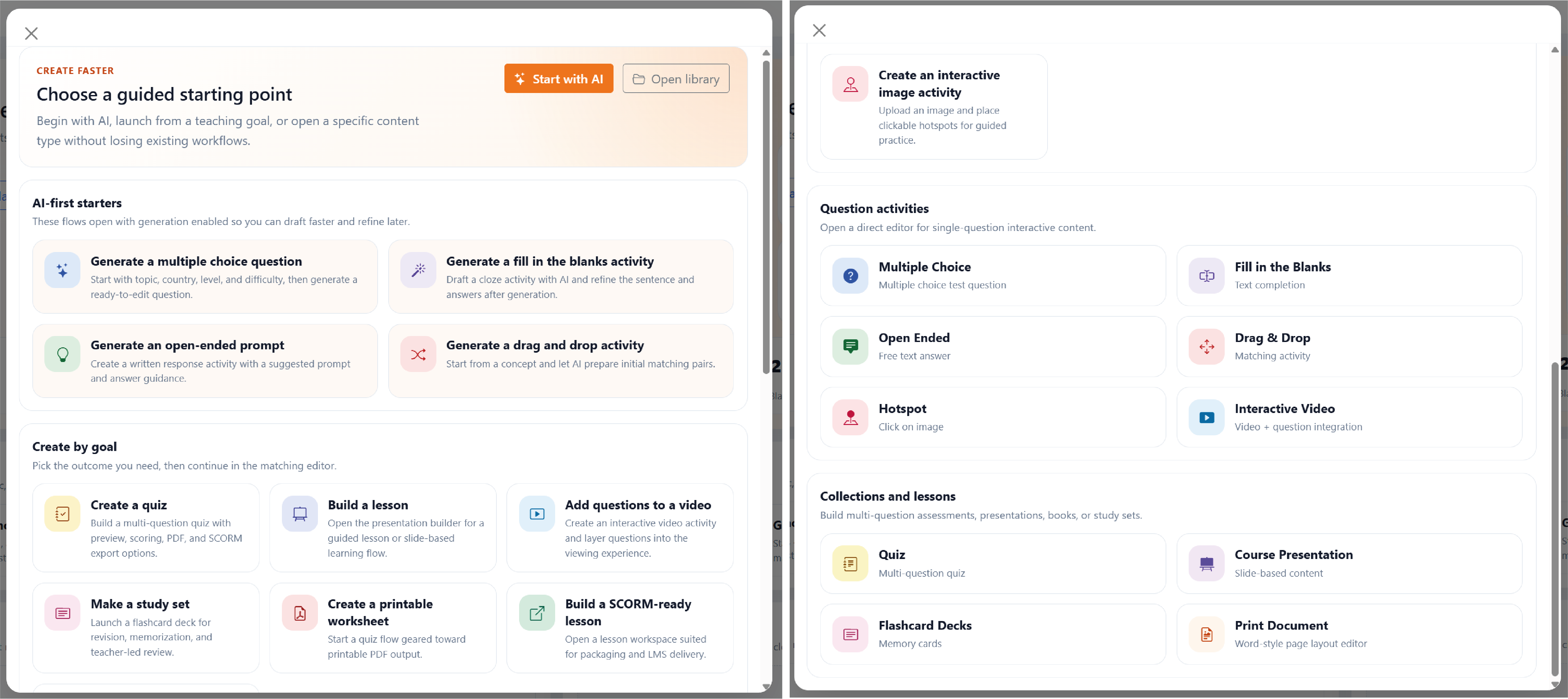 Aslında platformu üç katmanda düşünmek yeterli: önce tekil içerik üretirsin, sonra bu parçaları quiz, sunum ya da başka setlerde bir araya getirirsin, en sonda da paylaşım ya da SCORM/PDF aşamasına geçersin.