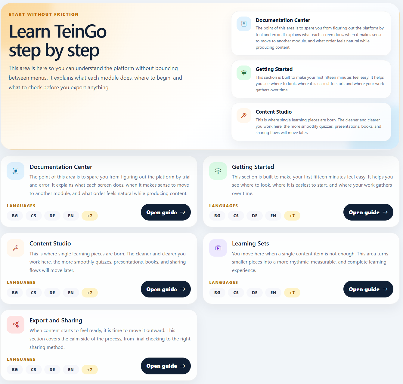 Buradaki rehberler sırayla okunmak zorunda değil. Bugün amacın soru üretmekse içerik stüdyosuna git, set kurmaksa öğrenme setlerine geç, çıktı almak istiyorsan export bölümünü aç.